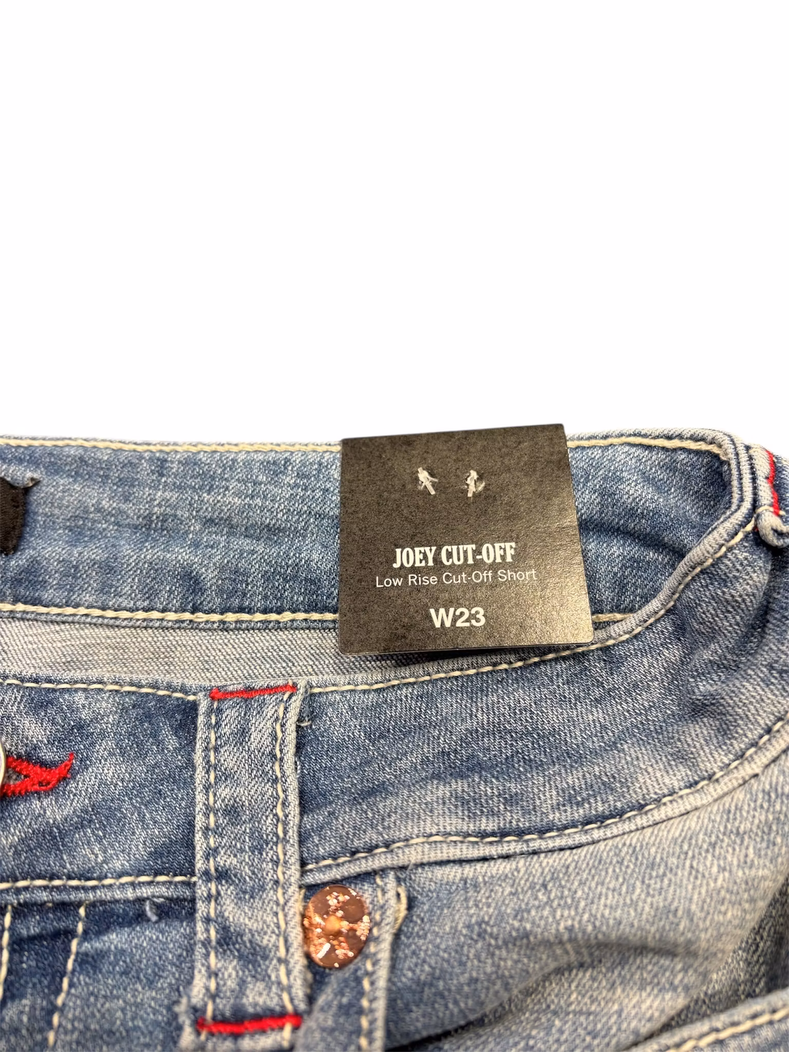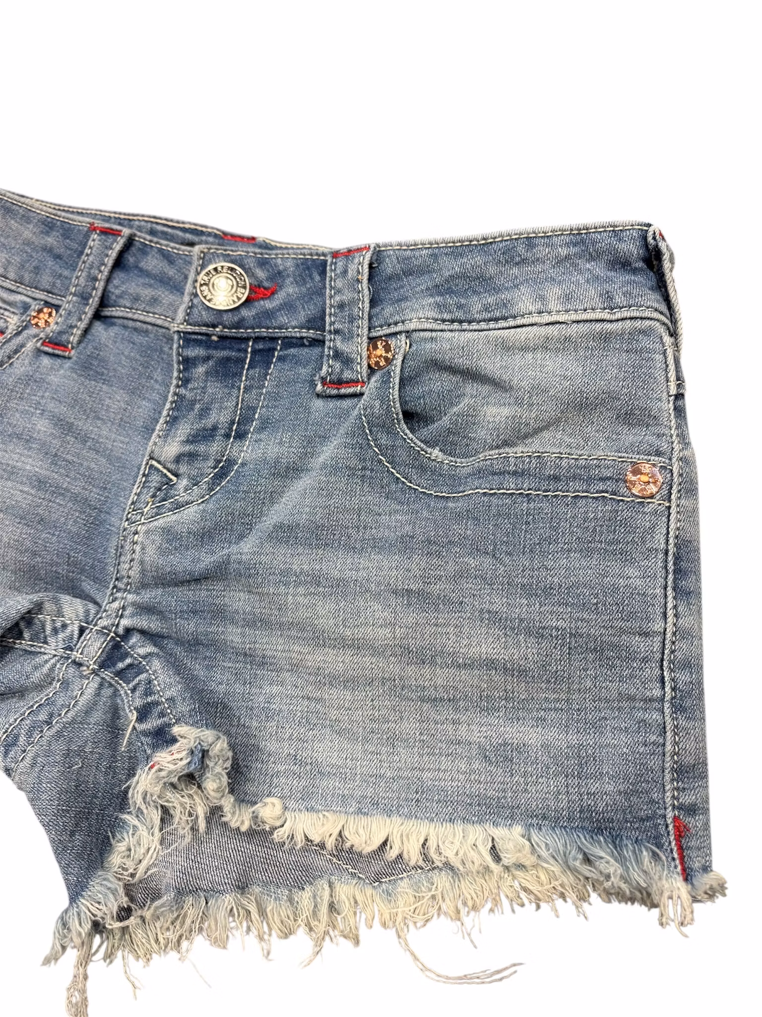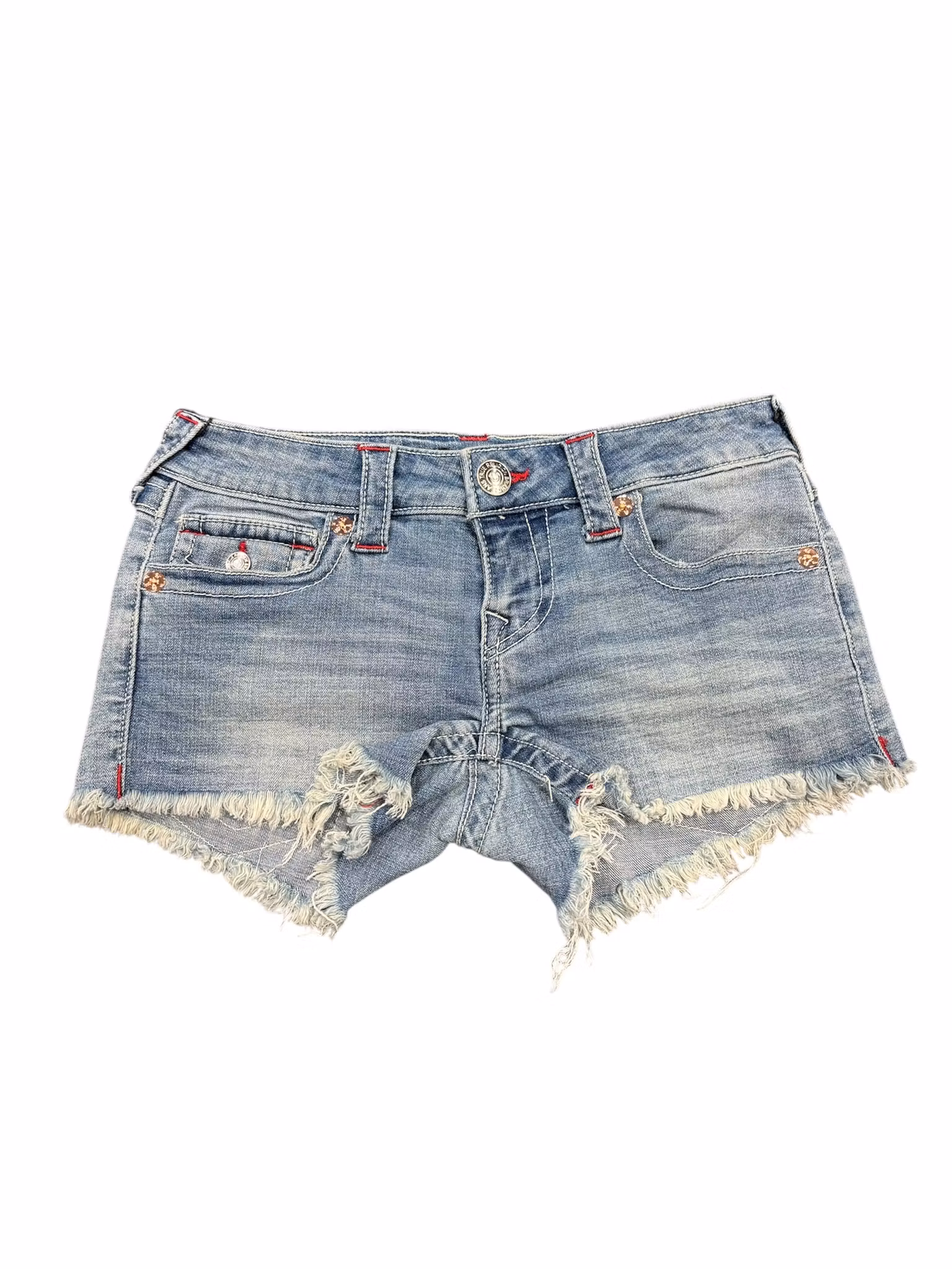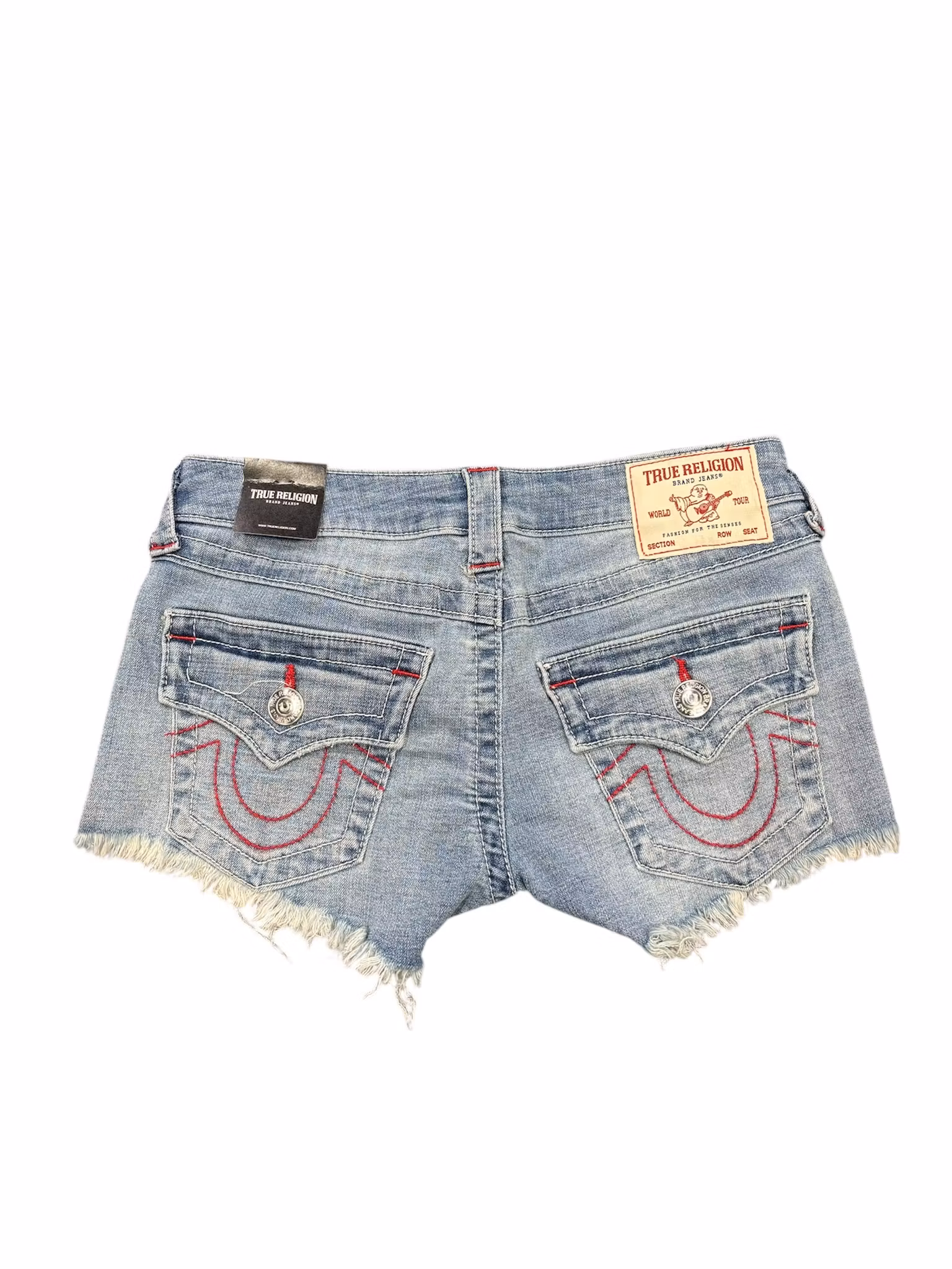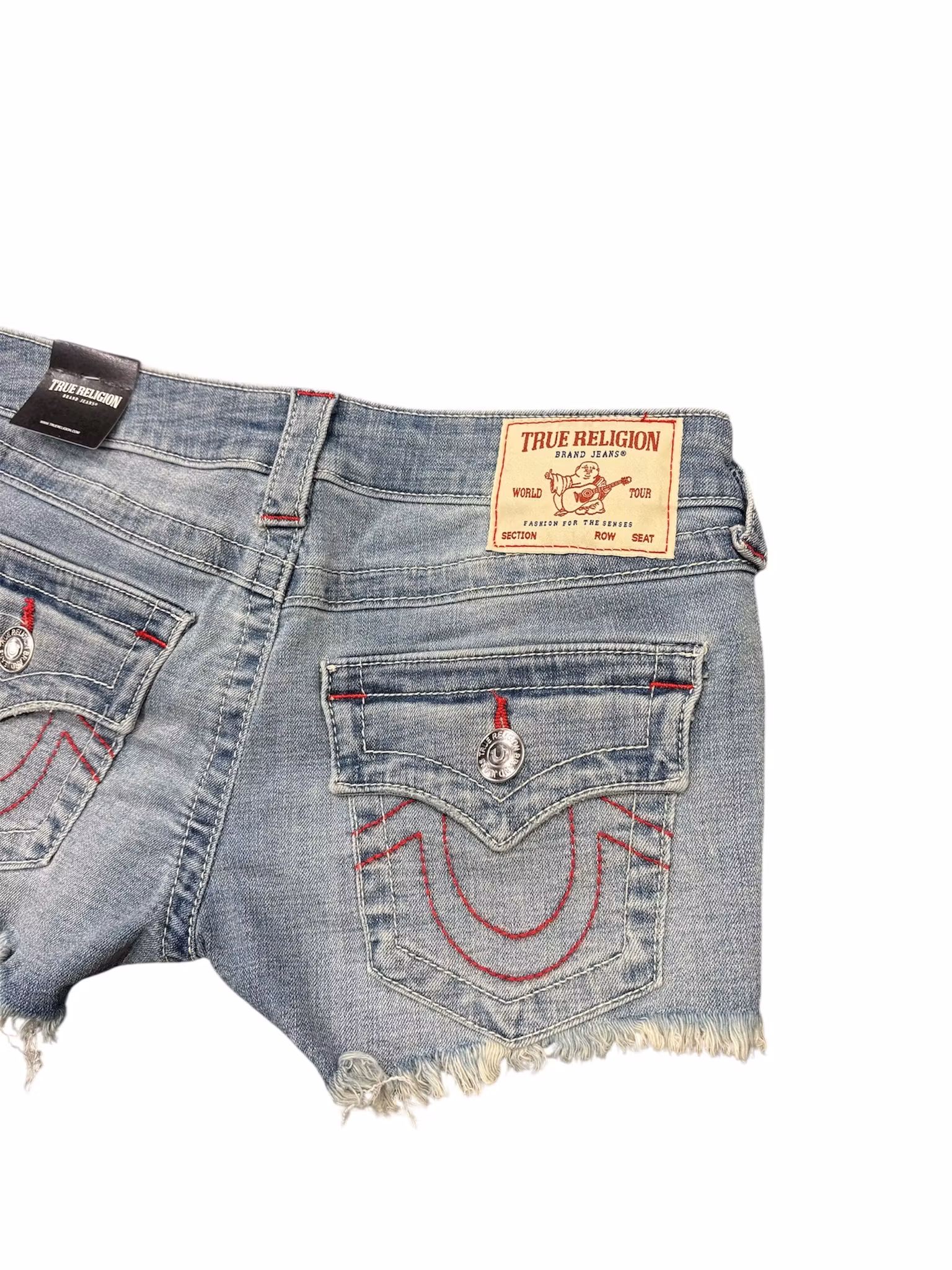 True Religion shorts, ett par ikoniska denimshorts designade med låg midja och den karakteristiska signaturstilen som gjort märket känt världen över. Shortsen har en lätt sliten look, fransade benslut och de klassiska bakfickorna med flap och knapp, komplett med den välkända True Religion‑patchen bak i linningen. Ett statement‑plagg för en avslappnad och självsäker sommarstil.