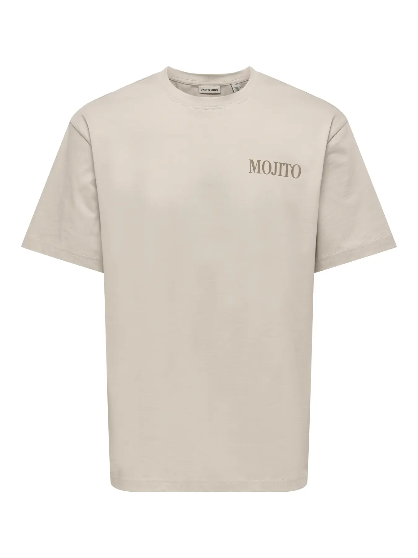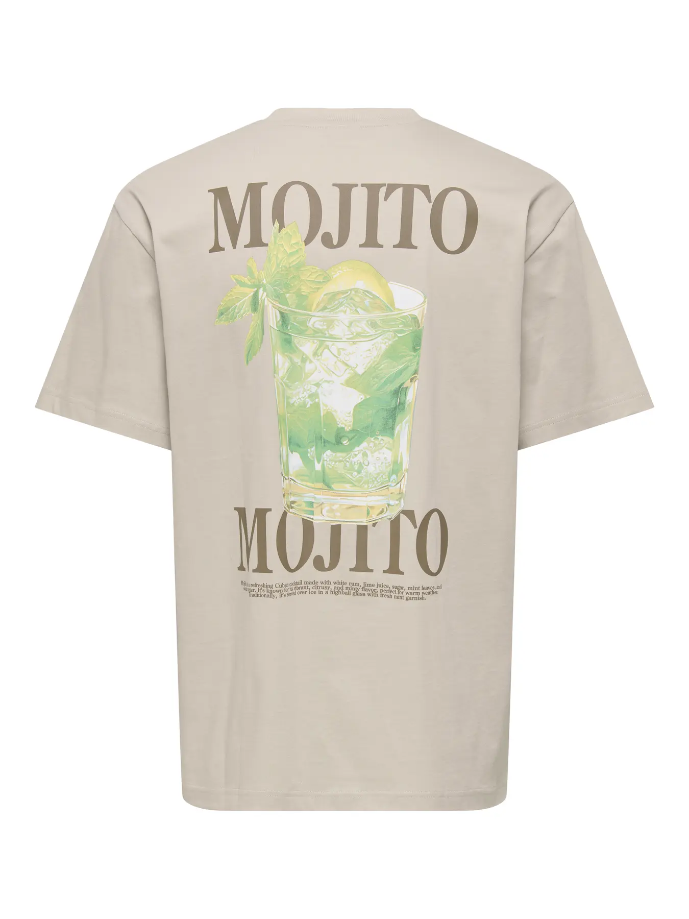 Only&Sons, En stilren beige t-shirt med en avslappnad, modern passform. Plagget har ett tydligt statement-tryck på ryggen med mojito‑tema, kombinerat m